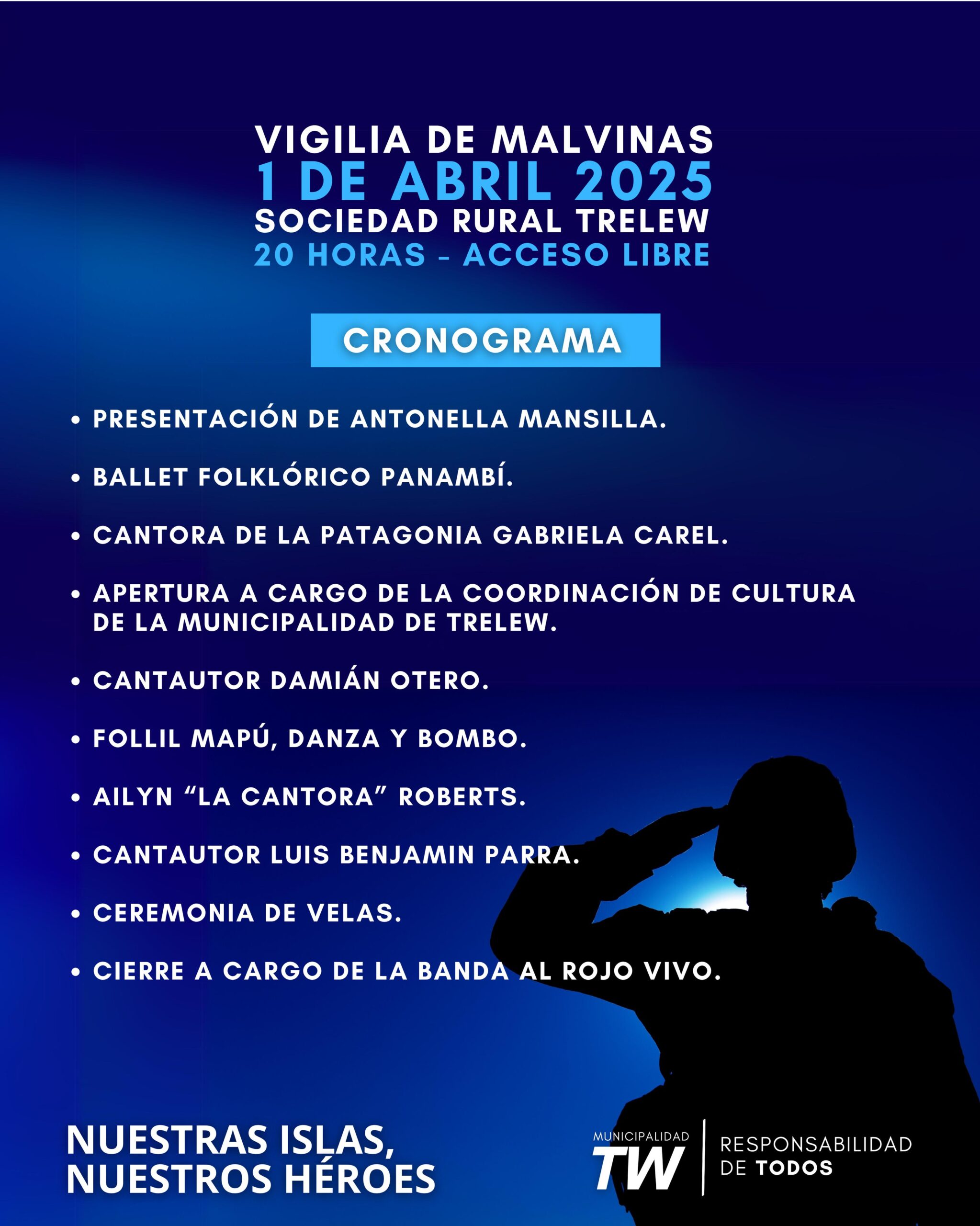La propuesta arranca el lunes 1 de abril a las 20 horas, con la tradicional vigilia en la Sociedad Rural Valle del Chubut, un espacio ya emblemático para el recuerdo y el encuentro con los familiares de los caídos. Durante la noche, artistas locales brindarán emotivos espectáculos de música y danza, entre ellos: Antonella Mansilla, Gabriela Carel, Damián Otero, Folil Mapú, el ballet Panambí, Ailyn Roberts y Luis Benjamín Parra. Como broche de oro, La Banda al Rojo Vivo acompañará el cierre tras la ceremonia de velas.