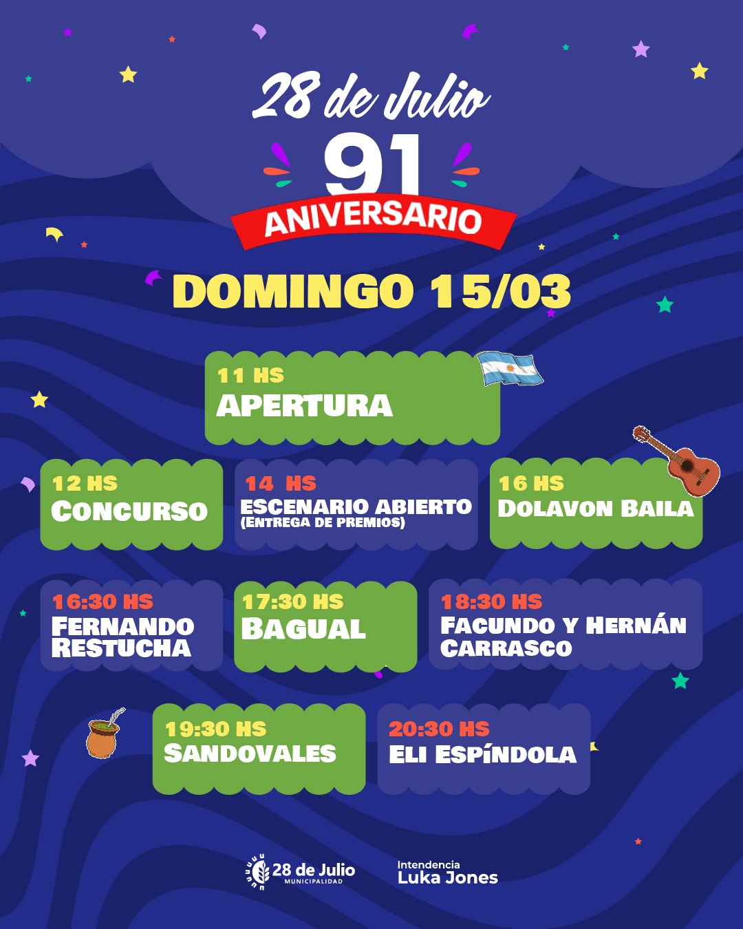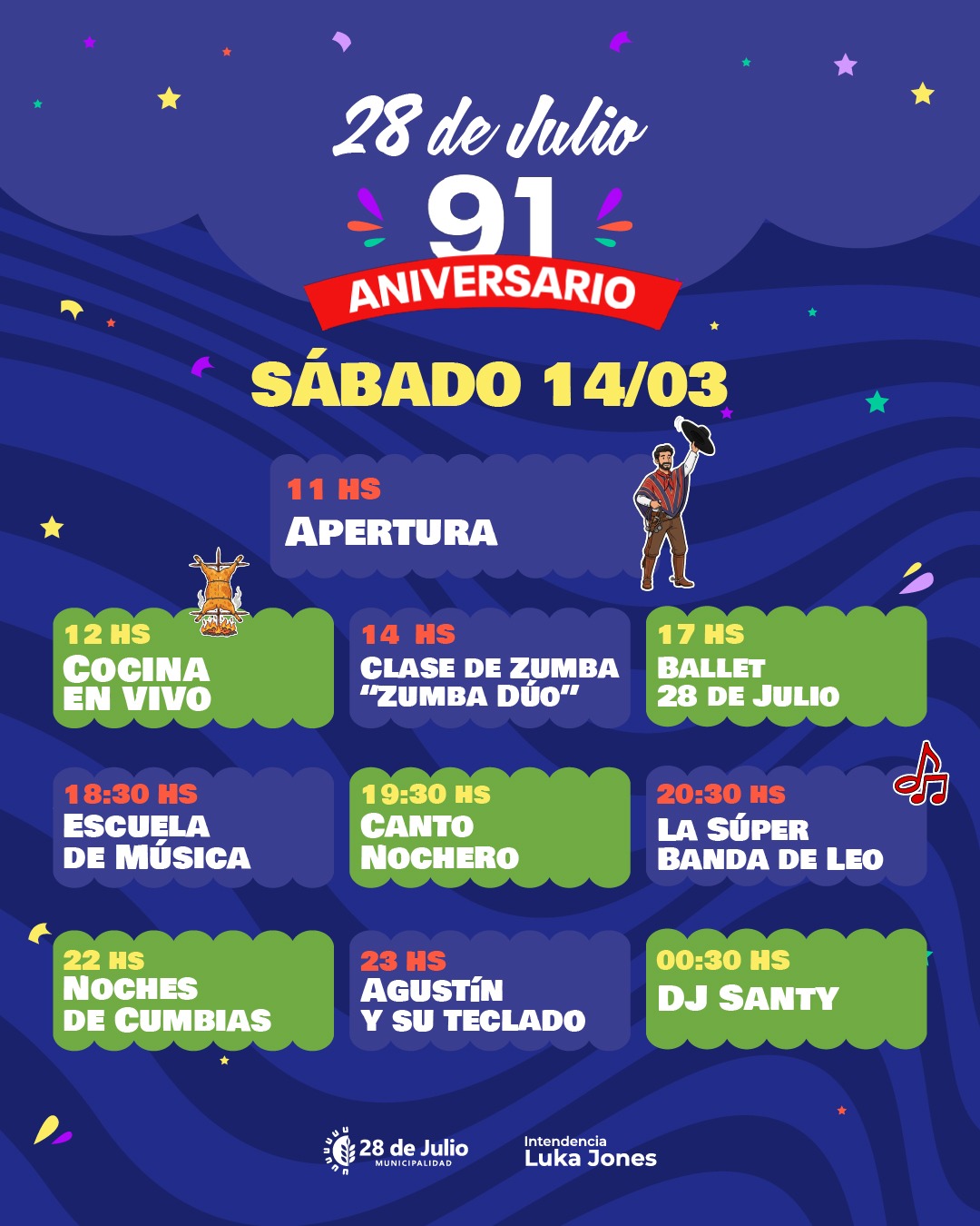 La localidad de 28 de Julio se prepara para celebrar su 91° aniversario con un amplio programa de actividades culturales, deportivas e institucionales que se desarrollará durante el sábado 14 y domingo 15 de marzo. La propuesta, organizada por la Municipalidad, tendrá como escenarios el Predio Ferial y distintos puntos del pueblo, con entrada libre y gratuita.