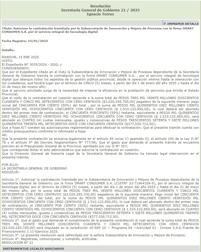 El gobierno de Ignacio Torres contrató por más de $4.000 millones a una empresa con antecedentes judiciales por irregularidades en contrataciones con el Estado. Se trata de Smart Consumer S.A., que opera bajo el nombre Prosumia, y que fue elegida para brindar “servicios integrales de comunicación y tecnología digital” durante el 2024 y 2025.