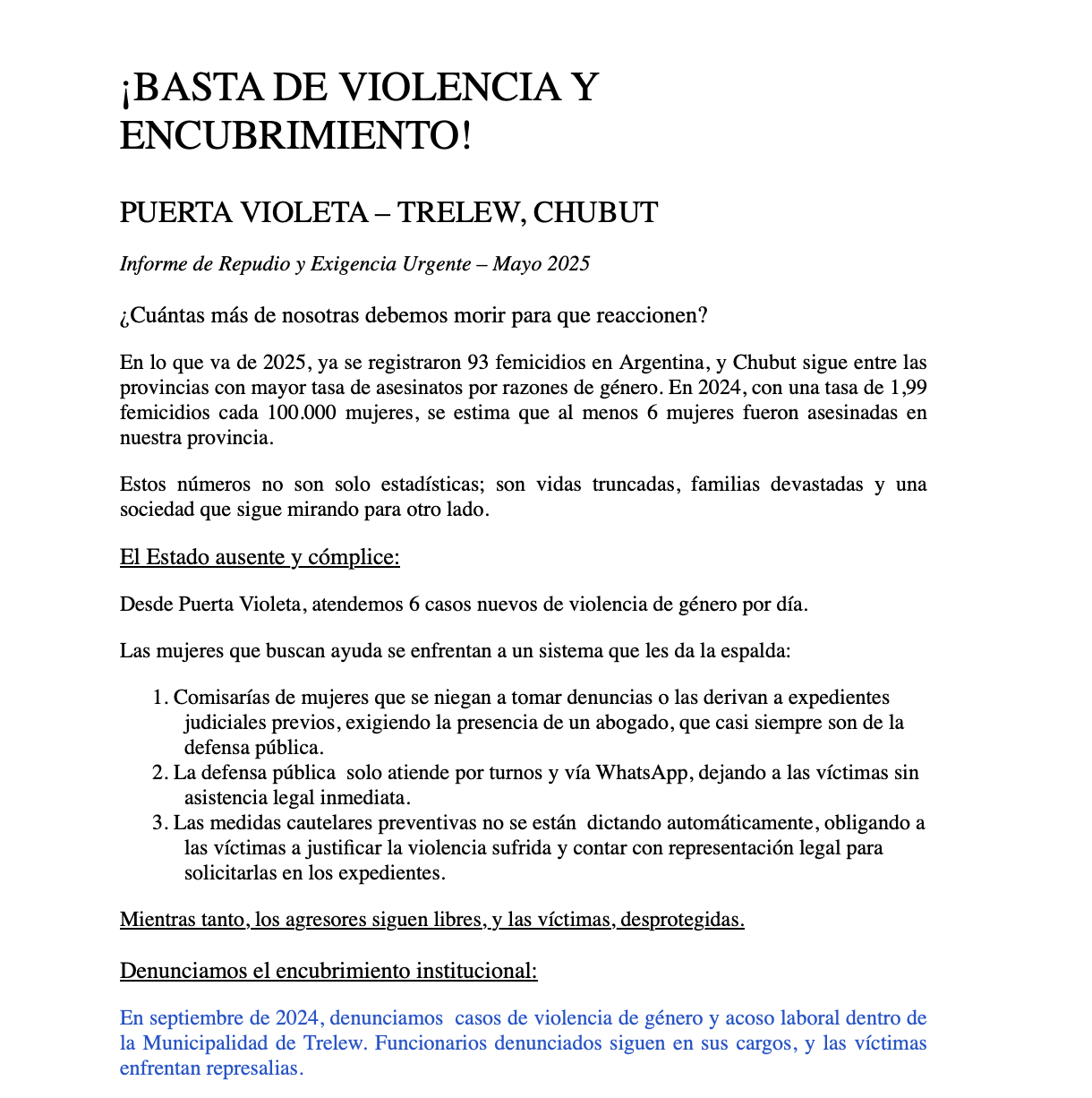 El informe también menciona casos de encubrimiento institucional. En septiembre de 2024, Puerta Violeta denunció situaciones de violencia de género y acoso laboral dentro de la Municipalidad de Trelew. A pesar de las denuncias, los funcionarios implicados continúan en sus cargos, mientras las víctimas enfrentan represalias.