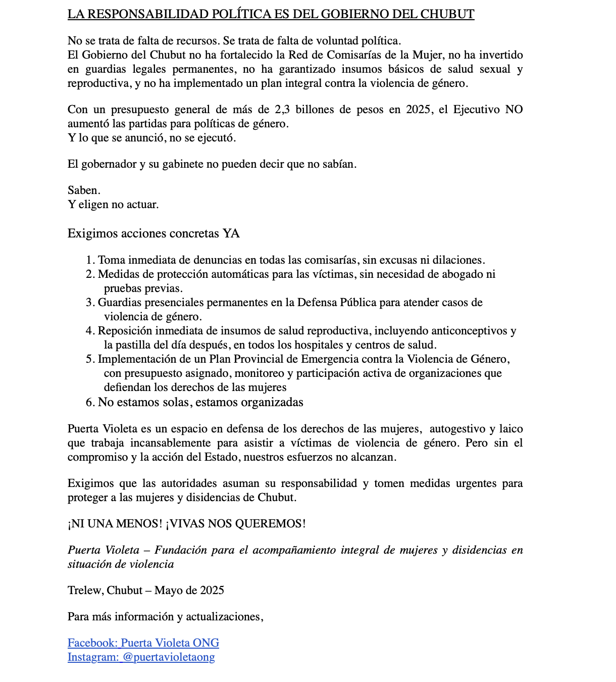 Además, la organización cuestiona al Gobierno del Chubut por la falta de recursos destinados a políticas de género. Según el informe, a pesar de que el presupuesto general de la provincia para 2025 supera los 2,3 billones de pesos, no se han incrementado las partidas para políticas de género. “El gobernador y su gabinete no pueden decir que no sabían. Saben. Y eligen no actuar”, señala el documento.