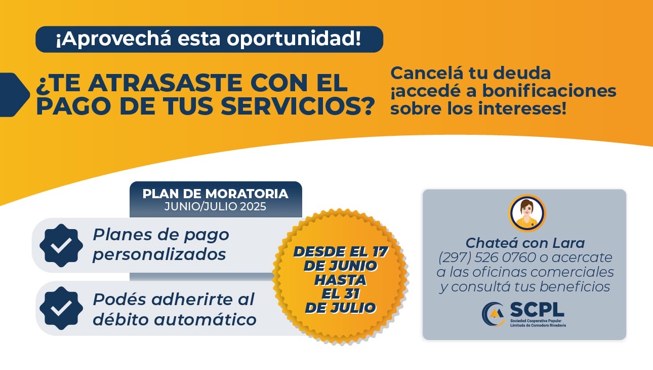 Para concluir, para más información sobre el Plan de Moratorio junio/julio 2025, comunicarse con nuestro asistente virtual Lara por WhatsApp al (297) 526 0760 o acercarse a nuestras oficinas comerciales de sede Central en San Martín 1641, Km. 8 en Alférez Vázquez 749 y Rada Tilly en Juan Guteff 2075, de lunes a viernes en el horario de 08 a 15 horas.