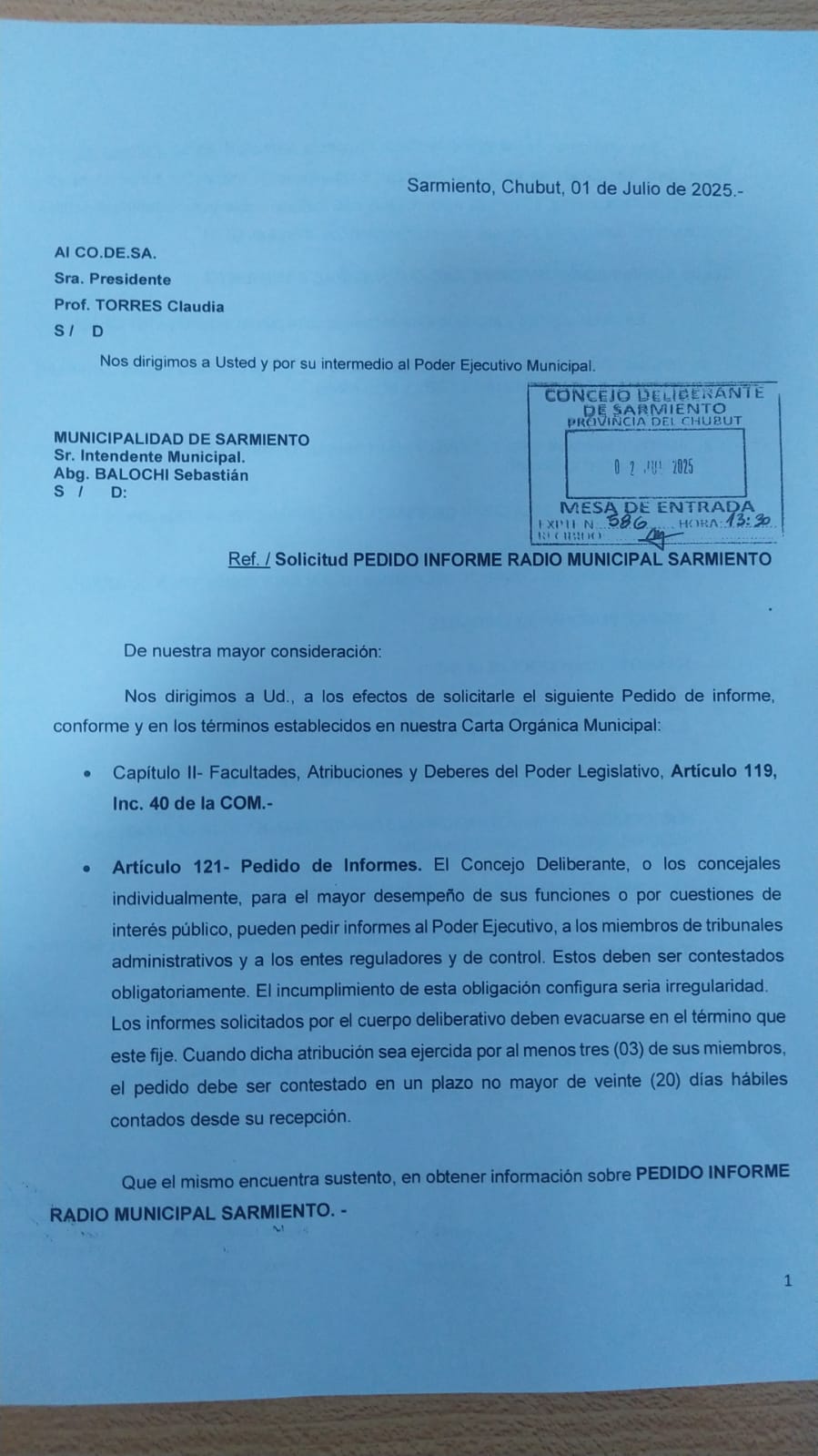 La reciente inauguración de la primera radio municipal de Sarmiento generó fuertes cuestionamientos desde el partido Alternativa Vecinal, que denunció que la apertura se realizó sin cumplir los pasos legales previstos en la Carta Orgánica local. La habilitación, según señalaron, debería haberse formalizado a través de una ordenanza del Concejo Deliberante y no mediante resolución del Ejecutivo.