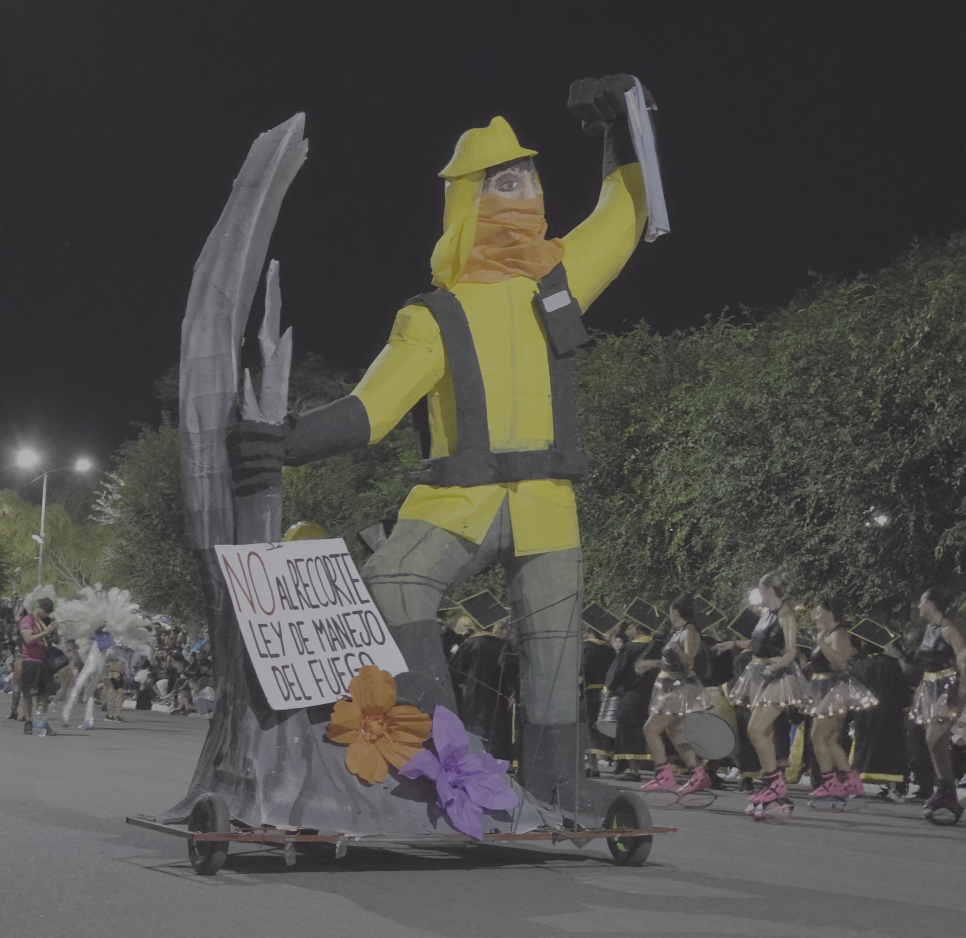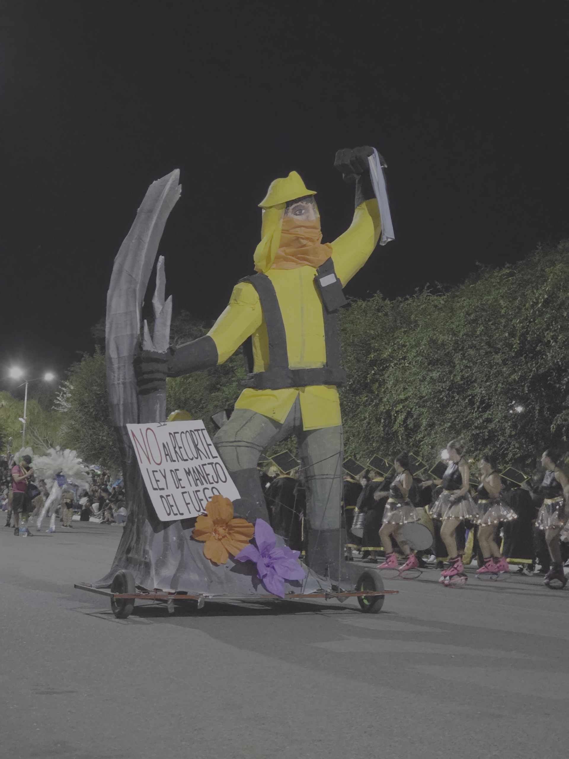 Entre las obras más comentadas estuvo el carro de un brigadista gigante que pedía “no al recorte de la Ley de Manejo del Fuego”. La figura, imponente, avanzó por el corsódromo como símbolo de respaldo a quienes combaten los incendios en la cordillera. Fue uno de los momentos más emotivos de la noche y dejó en claro que el carnaval también es un espacio para expresar lo que atraviesa a la región.