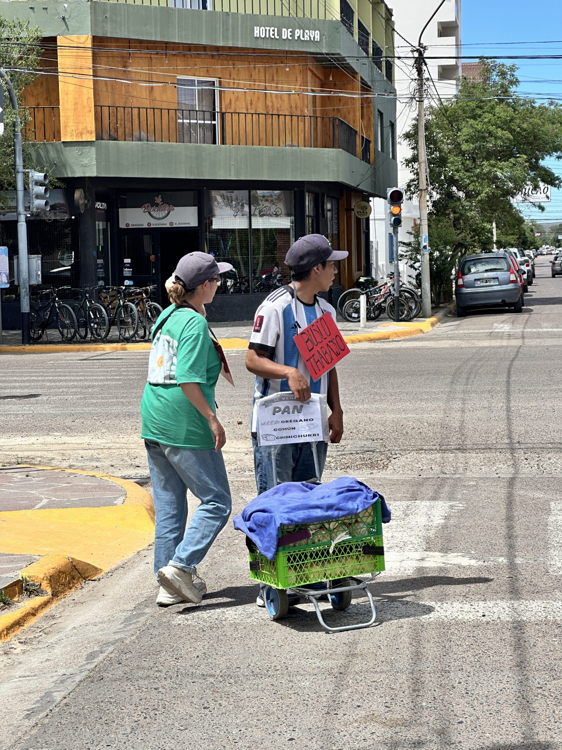 Su presencia en la esquina no busca generar pena, sino contacto. No buscan monedas: buscan un empleo. Y mientras tanto, sostienen sus días vendiendo pan de buena calidad, como explican ellos, y entregando currículums a quien lo solicite.