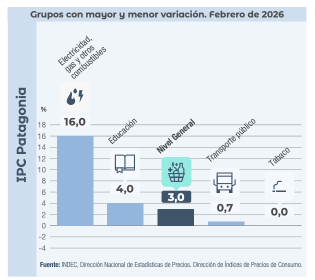 El Índice de Precios al Consumidor (IPC) registró en febrero de 2026 un aumento del 2,9% a nivel nacional, mientras que la región Patagonia alcanzó una suba del 3,0%, según el informe difundido este 12 de marzo por el Instituto Nacional de Estadística y Censos (INDEC).