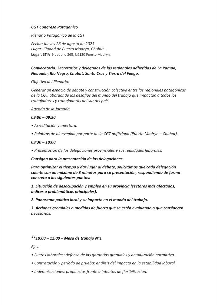 La organización está a cargo de la CGT del Valle Inferior del Río Chubut y Puerto Madryn, encabezada por Luis Núñez, junto al Sindicato de la Alimentación (STIA), que será sede de la jornada. Desde las 9 de la mañana se acreditarán las delegaciones de Chubut, Santa Cruz, Tierra del Fuego, Río Negro, Neuquén y La Pampa, con la consigna de poner en común las realidades locales y los desafíos comunes que enfrenta el sur del país.