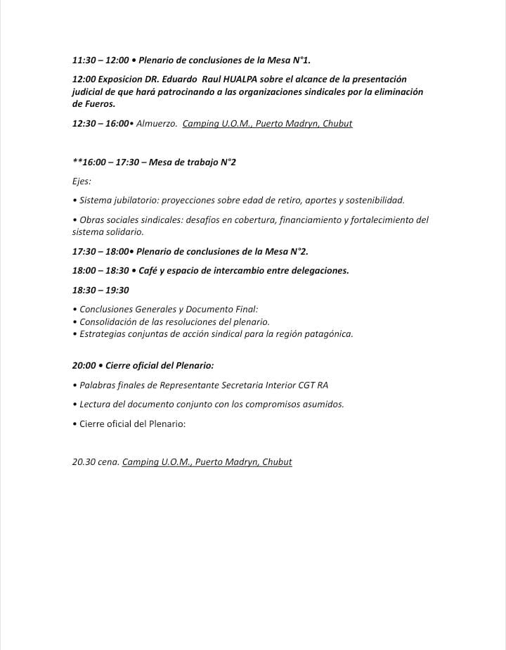 En la agenda del plenario aparecen algunos de los temas más sensibles para el movimiento obrero: la defensa de los fueros laborales, la discusión sobre contrataciones y período de prueba, los intentos de flexibilización de las indemnizaciones, la sostenibilidad del sistema jubilatorio y el financiamiento de las obras sociales sindicales. Además, está prevista la exposición del abogado laboralista Eduardo Hualpa sobre las presentaciones judiciales vinculadas a la eliminación de fueros.