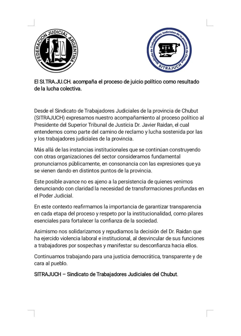 La Asociación de Magistrados y Funcionarios del Poder Judicial de Chubut anunció un pedido formal de juicio político contra el presidente del Superior Tribunal de Justicia, Javier Raidán, y denuncias penales contra los otros cinco integrantes de la máxima corte provincial. El sindicato SITRAJUCH acompaña el reclamo.