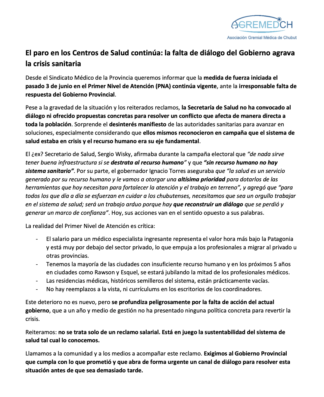 Desde hace más de tres semanas, los médicos del Primer Nivel de Atención (PNA) en Chubut mantienen un paro en reclamo de mejores condiciones laborales y salariales. La medida de fuerza, que comenzó el pasado 3 de junio, sigue vigente ante la ausencia total de respuestas por parte del Gobierno Provincial.