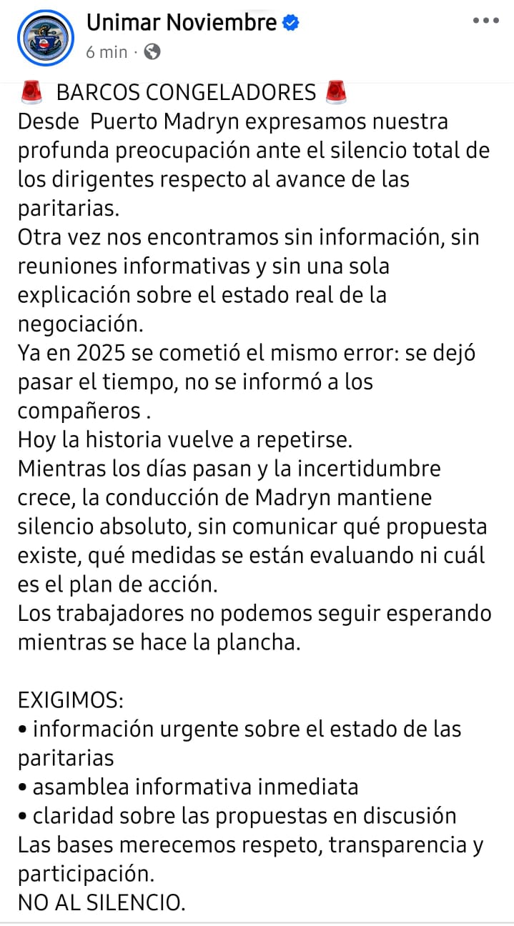 Trabajadores de barcos congeladores de Puerto Madryn expresaron su preocupación por el “silencio total” de la conducción del SOMU respecto al avance de las paritarias y advirtieron que la situación se agrava por la prórroga judicial de los mandatos sindicales.