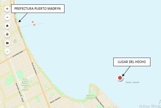 Más tarde se sumó un guardacostas con personal especializado en buceo perteneciente a la Estación de Salvamento, Incendio y Protección Ambiental de la fuerza en Puerto Madryn. Las tareas se desarrollan de manera coordinada en el sector marítimo frente a la ciudad.