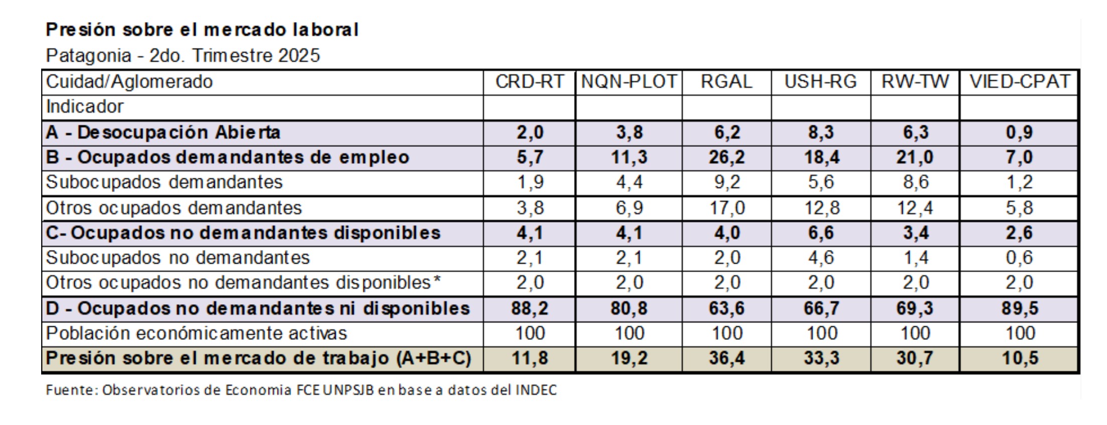 El informe del Observatorio de Economía de los Recursos Naturales de la Patagonia Sur (septiembre 2025) ubica a Río Gallegos a la cabeza de la presión laboral en toda la Patagonia. Este indicador —que contempla a desocupados, subocupados y ocupados que buscan un nuevo empleo— llegó al 36,4%, un número muy superior a la media nacional del 30,5%.