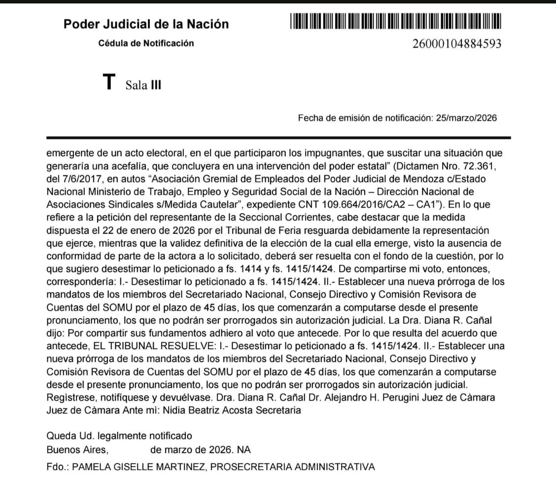 El origen de la situación se remonta a las elecciones del SOMU realizadas entre el 1 y el 5 del año pasado, cuando una lista opositora a nivel nacional denunció que no fue habilitada para participar y presentó una impugnación.