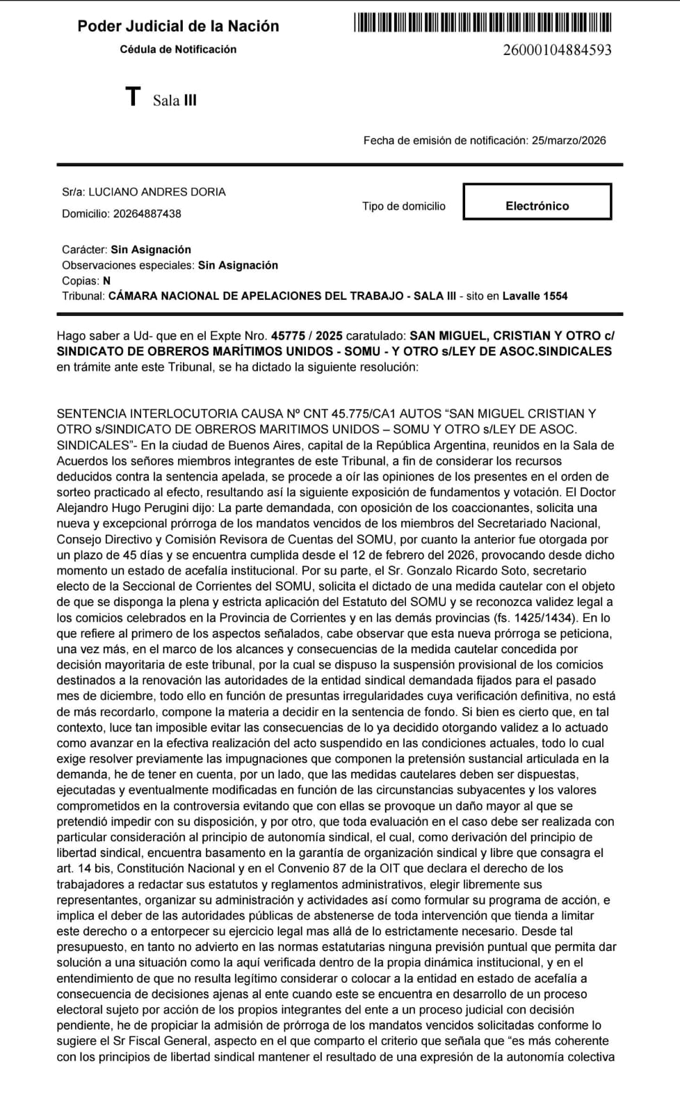 La Cámara Nacional de Apelaciones del Trabajo resolvió extender por otros 45 días el mandato de la conducción del Sindicato de Obreros Marítimos Unidos (SOMU), en el marco del conflicto abierto tras las elecciones realizadas el año pasado.
