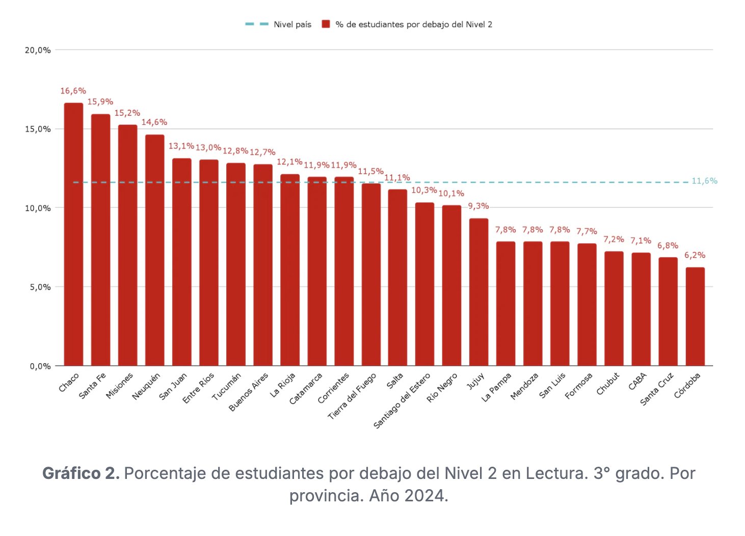 Estas pruebas, realizadas por la Secretaría de Educación de la Nación, se enmarcan en el Plan Nacional de Alfabetización, que busca abordar este problema a nivel nacional. Sin embargo, los datos obtenidos dejan en claro que aún queda mucho por hacer. Según los resultados, las 3 provincias con mayores porcentajes de estudiantes que no logran leer textos simples son Chaco (16,6%), Santa Fe (15,9%) y Misiones (15,2%), mientras que las provincias con mejores desempeños son Córdoba (6,2%), Santa Cruz (6,8%) y la Ciudad Autónoma de Buenos Aires (7,1%) y Chubut (7,2%).