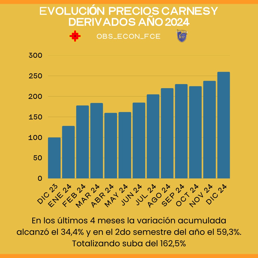 “La carne, por ejemplo, pasó a tener un incremento de 162,5% en la Patagonia, lo que muestra una diferencia clara con el resto del país. En años anteriores, la carne había perdido protagonismo en la canasta, desplazada por las frutas y verduras. Pero en 2024, la carne volvió a ocupar el 30% de la canasta alimentaria, el mismo porcentaje que históricamente tuvo”, agregó Herrera.